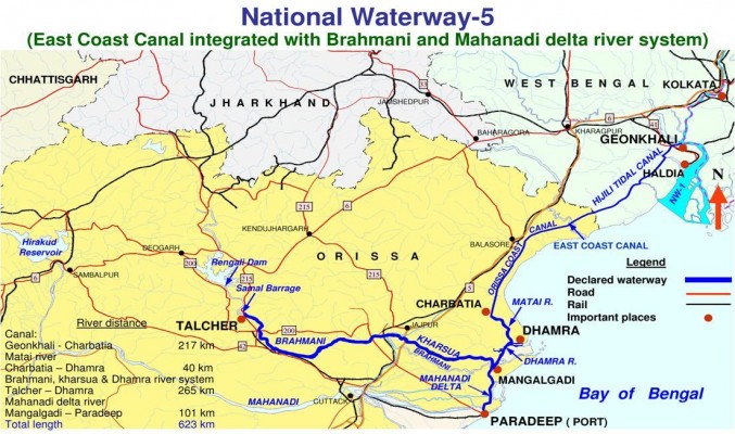 National Waterways 5 connects Orissa to West Bengal using the stretch on Brahmani River,East Coast Canal,Matai river and Mahanadi River Delta. The 623 km long canal system will handle the traffic of cargo such as coal, fertilizer, cement and iron.